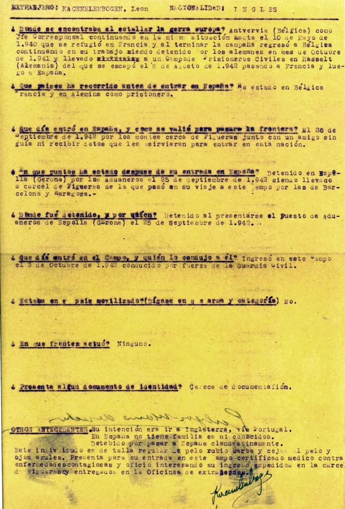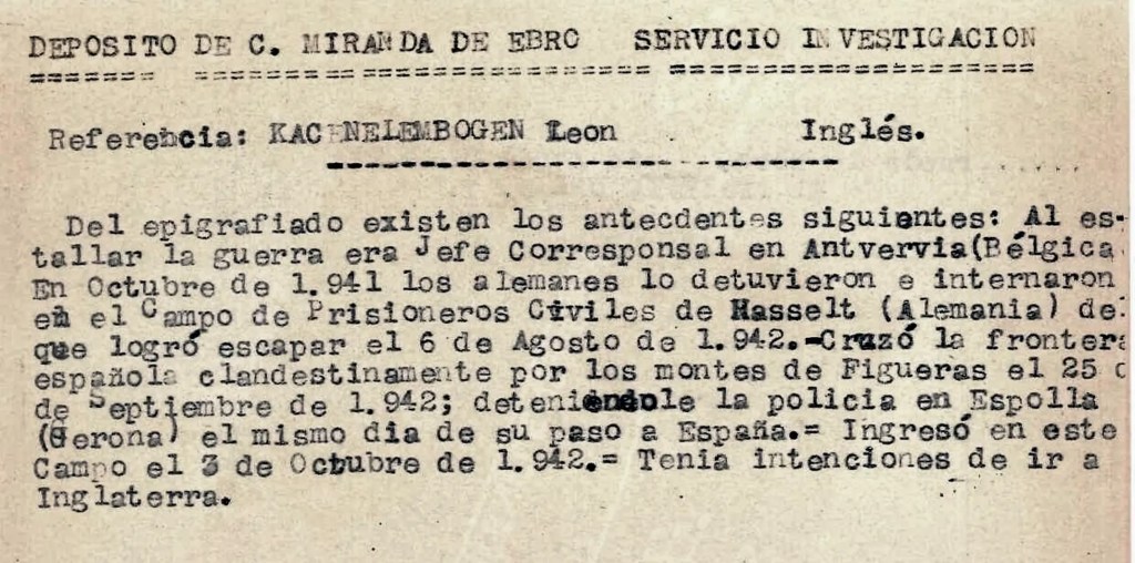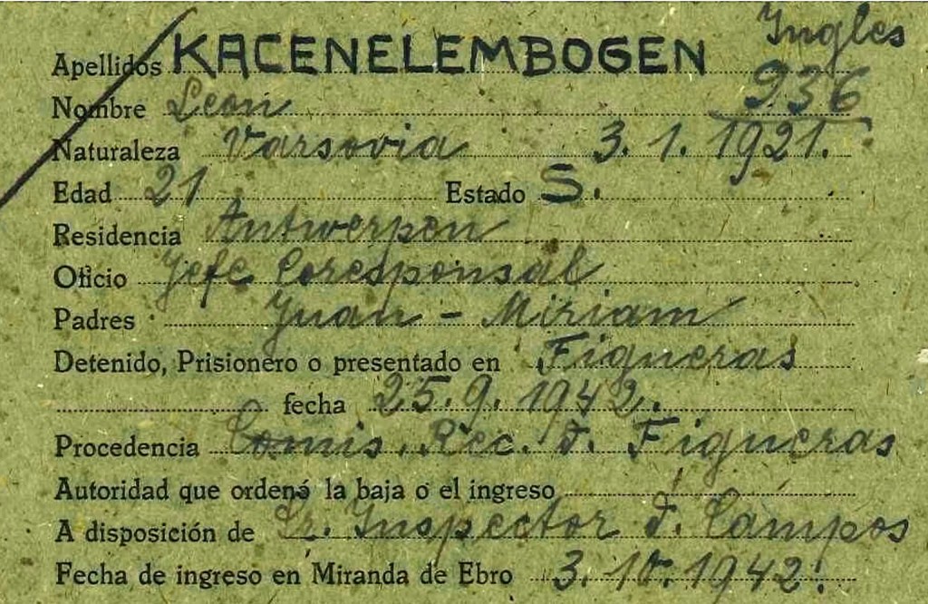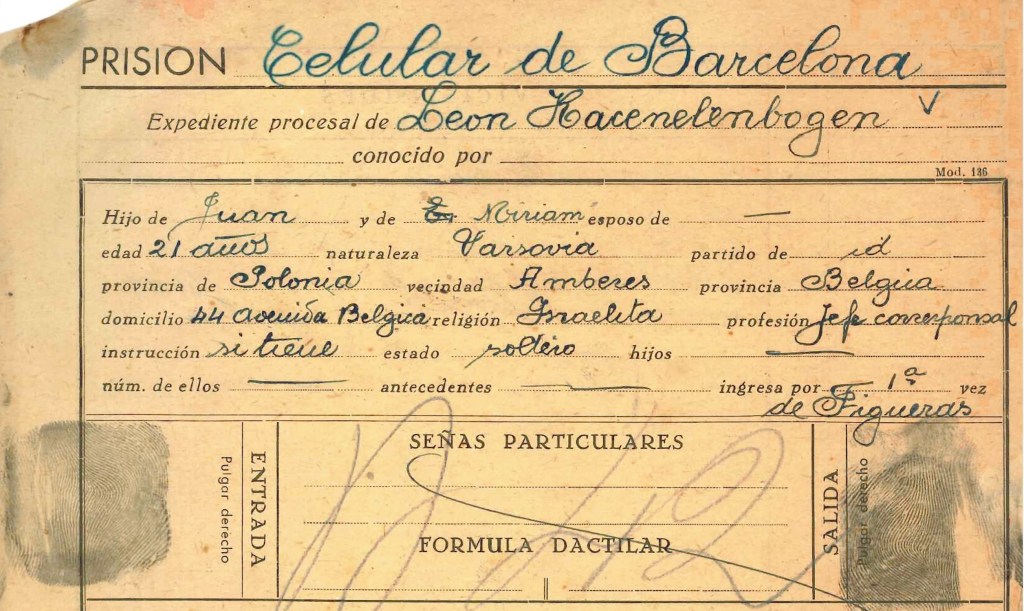 Léon passe donc bien pour un Anglais. Or, cela aurait pu très mal tourner, et dès le début. Je l’apprends en recevant de l’historien Josep Calvet la fiche de Léon éditée lors de son passage à la prison de Barcelone qu’il fréquente du 29 septembre au 1er octobre 1942. Léon, au nom de famille cette fois très bien orthographié, y est redevenu un juif polonais de Belgique ! Comment cela est-il possible ? Josep répond : à Barcelone « l’interrogatoire est plus strict. En revanche, à Figueras et Miranda de Ebro, ils notent ce que dit le détenu sans détecter ni s’interroger sur les incohérences ». Et sans jamais communiquer entre eux non plus de toute évidence ! Les lourdeurs de l’administration ont parfois du bon.
