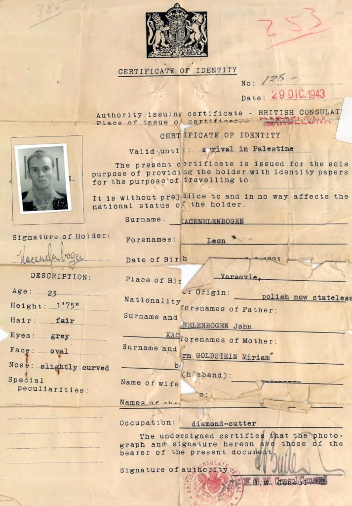 Le document à l’origine de ce résultat est une demande de naturalisation auprès de l’autorité britannique en Palestine datant de 1946 : il avait donc survécu à l’Holocauste ! Lui qui voulait vivre ! La documentation reproduite tant en hébreu qu’en anglais nous apprend qu’il est tailleur de diamants et qu’il habite à Netanya. Surtout, on trouve une pièce maîtresse à ce dossier : un papier d’identité daté du 29 décembre 1943 et tamponné par l’Ambassade de Grande-Bretagne à Barcelone. Mais que faisait donc Léon avec les Anglais en Espagne fin 1943 alors que nous l’avions laissé dans son camp de Nexon en août 1942, avec une chance de survie des plus faibles ? Par quel parcours qu’on pressent désormais extraordinaire notre ami a-t-il réussi à s’extraire des pièges mortels qui lui étaient réservés ? Quand et comment était-il arrivé à fuir ?