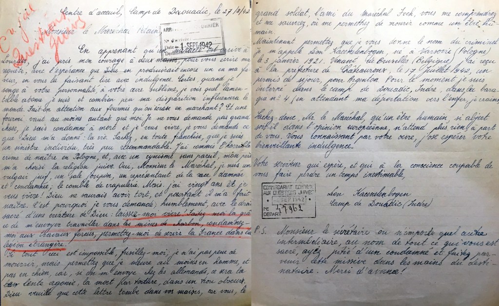 La recherche débute évidemment par la lecture très attentive de leur contenu afin d’y traquer tous les indices susceptibles d’aider l’investigation. La première est datée du 27 août 1942. Il est alors enfermé au camp de Douadic et demande au Maréchal de l’aider. On devine qu’il a été arrêté la veille, lors de la rafle des juifs en zone libre du 26 août. Sa seconde lettre, toujours adressée au vieux Pétain, est datée du lendemain ; cette fois-ci, il est prisonnier du camp de Nexon. De ces deux missives, on devine un jeune homme singulier, à la fois insolent et sincère, plein d’espoir et aux abois. Un personnage unique. Voyez par vous-même :