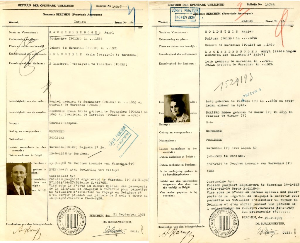 J’ai obtenu l’accord de la famille pour accéder aux fichiers « d’étrangers » des Kacenelenbogen conservés aux Archives générales du Royaume belge. Azryl & Marjem, Léon, Bella et Jacob ont chacun un dossier à leur nom. En effet, ils ne deviendront Belges qu’après la guerre. Et en attendant d’obtenir cette nationalité, ils doivent régulièrement s’enregistrer comme étrangers.