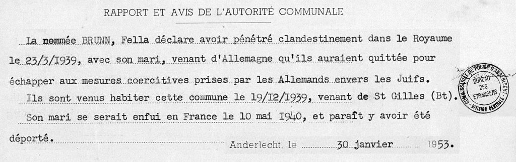 En avril 1939, leur adresse est celle de la boutique d’Azryl, au 102 rue du Pélican. Puis au mois de mai, Fella et Jacob s’installent à Bruxelles. Ils y vivront toute une année, jusqu’au début de la guerre, jusqu’au départ de Jacob pour la France le 10 mai 1940 comme le déclarera son épouse Fella au cours d’un interrogatoire de 1953.