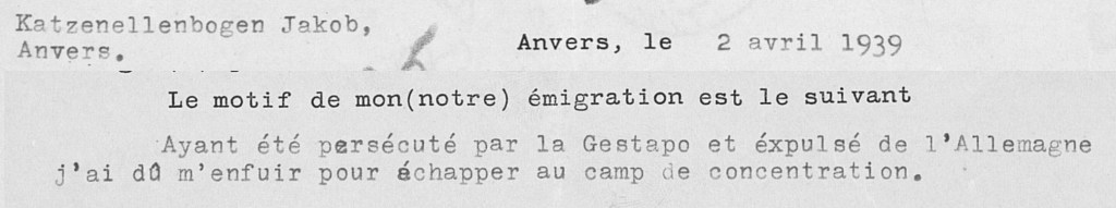 La Belgique a également conservé un « dossier d’étranger » au nom de l’oncle Jacob Katzenellenbogen – celui qui aurait rencontré Léon à Drancy – qui porte le patronyme familial avec cette orthographe. Ce dossier nous conte un parcours bien différent de celui des K. d’Anvers.