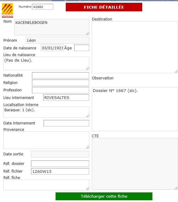 Si Léon n’est pas allé au camp du Vernet, il aurait en revanche « fréquenté » celui de Rivesaltes, comme on me l’avait indiqué. Les archives sont à Perpignan, mais en attendant de s’y rendre, le site des Archives départementales des Pyrénées-Orientales propose une recherche par nom d’internés. Je tape immédiatement « Kacenelebogen » oubliant par mégarde une lettre, le deuxième N. C’est important, car la recherche sur ce site n’est qu’exacte. Une faute et le nom ne sort pas. Cette erreur, c’est ma grande chance, car sa fiche apparaît immédiatement, avec la faute. Je ne m’en aperçois même pas. Je m’en rendrai compte plus tard, en voulant à nouveau rechercher la fiche de Léon et n’arrivant plus à la localiser avec son nom bien orthographié.
