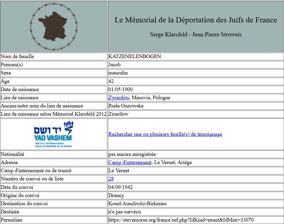 Elle a « simplement » trouvé le nom de Jacob sur le site de Jean-Pierre Stroweis, réalisé à partir des données Klarsfeld : https://stevemorse.org/france/. Les réponses sont parfois très simples, encore faut-il avoir connaissance des moyens qui permettent d’y parvenir.