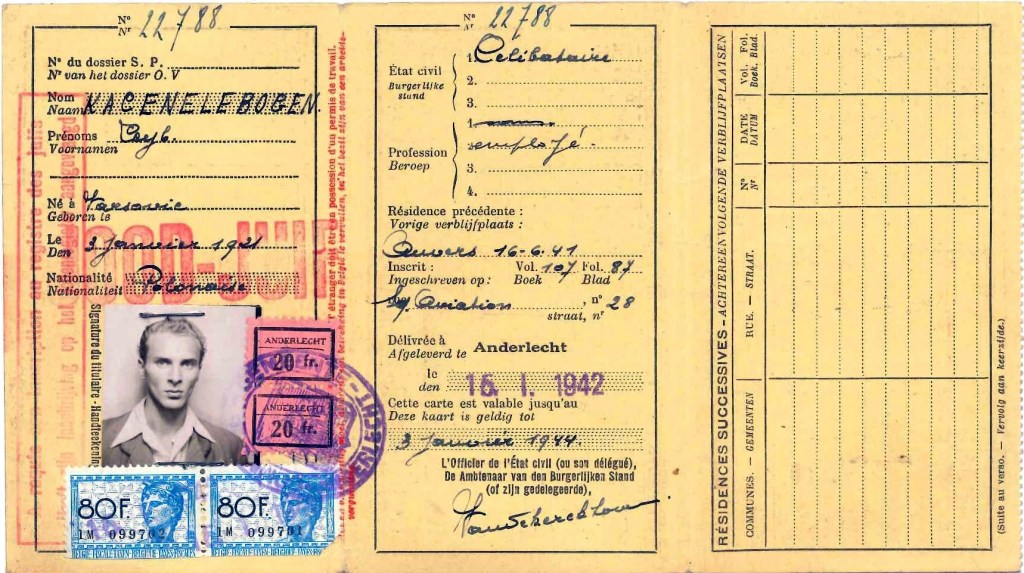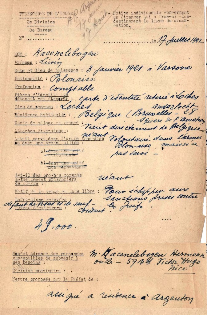 On y trouve tout d’abord le procès-verbal de l’arrestation de Léon, puis une pièce d’identité avec photographie émise à Bruxelles en janvier 1942, une « notice individuelle » et enfin, un sauf-conduit pour Châteauroux. La pièce d’identité date du 15 janvier 1942. Léon est donc bien encore en Belgique à cette date. Un énorme tampon rouge barre l’une des pages : « Jood / Juif ». Son nom est mal orthographié, il manque le deuxième N à Kacenelenbogen. Cette carte a été saisie lors de l’arrestation de Léon. Elle a été conservée dans les papiers de la préfecture, puis dans les cartons des archives départementales. Jusqu’à nous.