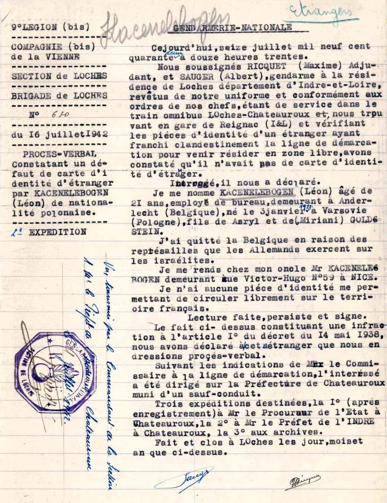 – Léon a été arrêté par l’adjudant Maxime Ricquet et le gendarme Albert Sauger de la brigade de Loches le 16 juillet 1942, à Reignac-sur-Indre, à bord du train « Loches-Châteauroux », car il n’avait « pas de carte d’identité d’étranger » ;