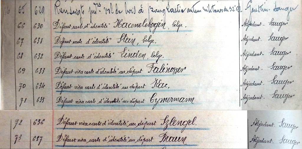 Léon a été interpellé en même temps que sept autres passagers dont seuls les noms de famille ont été consignés. Tous le sont pour le même motif, « Défaut visa carte d’identité au départ » :
