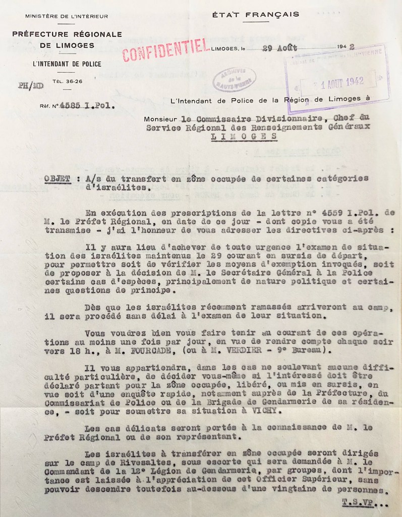 Un document des archives de la préfecture de Limoges me prouve pourtant le contraire : Rivesaltes est un « hub », une place centrale vers laquelle une partie des raflés du 26 août de tout le territoire de la zone libre sont regroupés. Comme des colis Amazon, ils sont ensuite redirigés en masse à 800 kilomètres de là, à Drancy, puis très vite à Auschwitz.