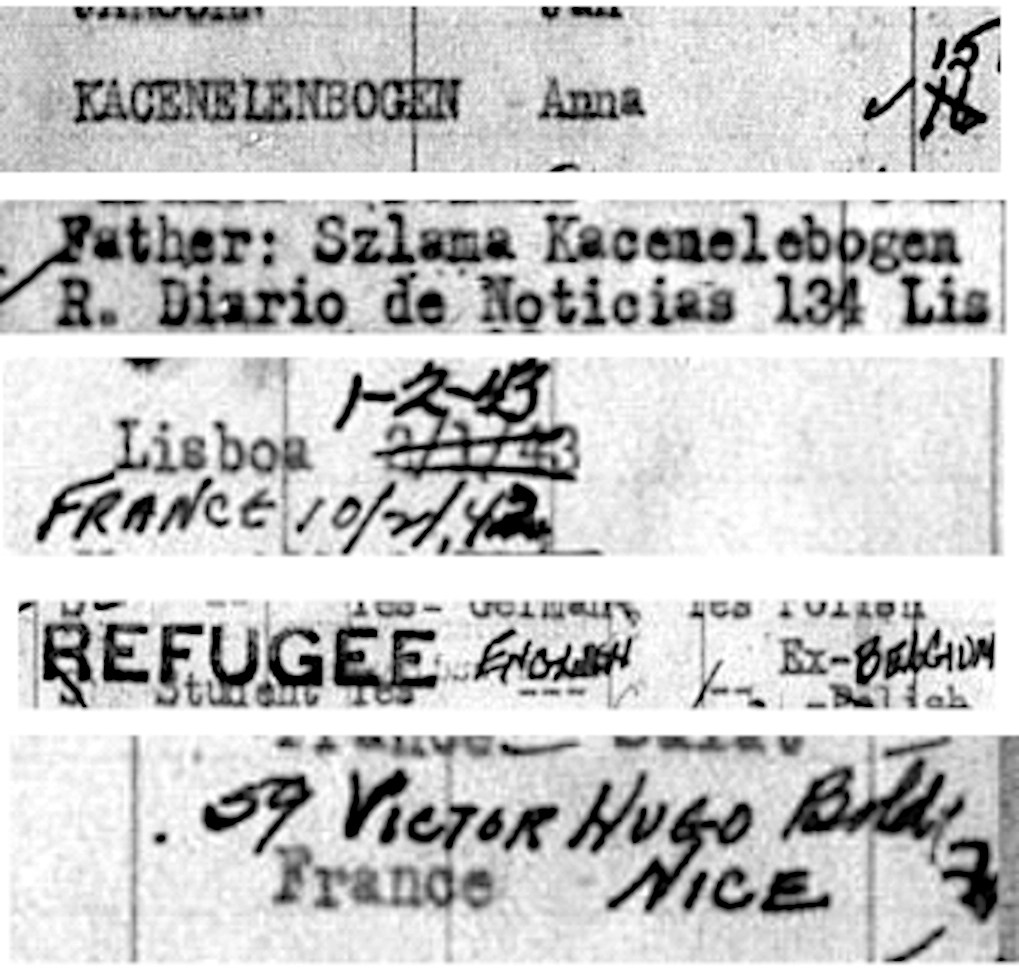 Ils y resteront quelques mois. Peut-être attendent-ils l’arrivée de Léon ?Mais ils doivent de nouveau fuir, sans doute aux alentours de la fin août 1942, avant ou après la rafle de la zone libre qui voit Léon se faire arrêter. Si on connaît cette date, c’est que nous retrouvons la famille à Vigo, ville espagnole à la frontière portugaise, le 8 novembre 1942. Ils ont dû franchi les mêmes Pyrénées que Léon en passant la frontière espagnole. Oh, sans doute pas au même endroit, mais à la même période. En revanche, eux ont réussi à ne pas se faire arrêter, ont continué vers le Portugal au tout début de l’année 1943, sans doute aidés par le Joint comme en témoigne cette fiche :