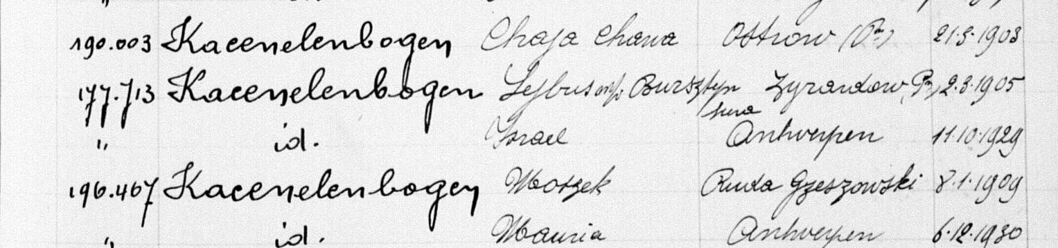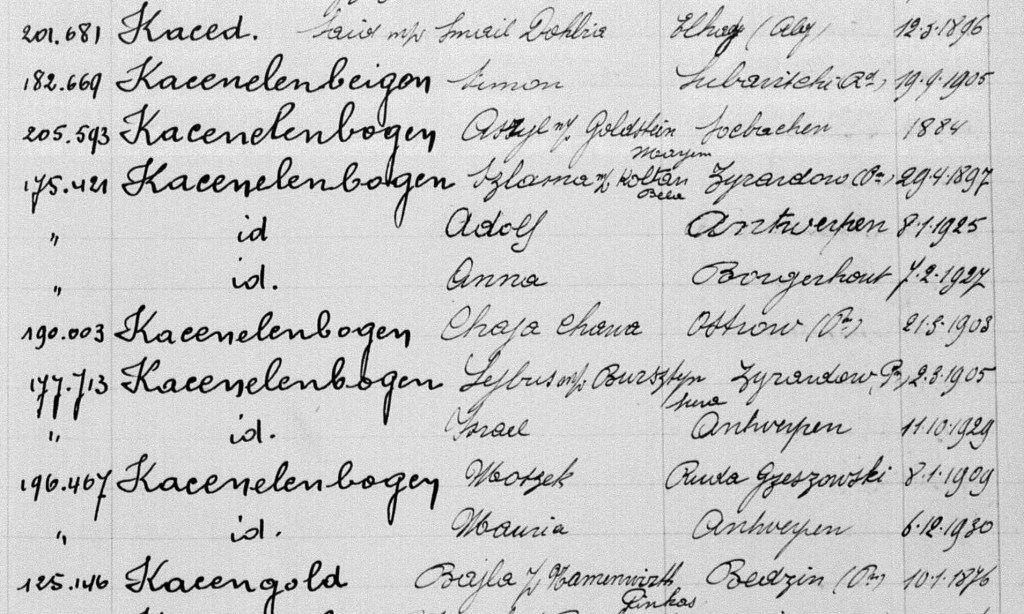 J’interroge mon informateur familial n°1 sur cet oncle supposé. On me raconte alors qu’Azryl, le père de Léon, avait beaucoup – beaucoup ! – de frères et sœurs. Tous sont nés en Pologne et tous ont émigré soit en Belgique, soit aux USA à la fin des années 1920. Tous sauf Jacob, qui connaîtra un destin différent de sa fratrie [Lire : 5 – L’improbable rencontre avec l’oncle Jacob]. On retrouve dans les Archives générales du Royaume belge des listes d’arrivées d’étrangers. Parmi les noms des années 1928/1929, on relève quatorze Kacenelenbogen sur dix lignes, tous de la même famille !